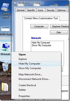 5. Open WinBubble > miscellaneous tab > Click the "Network" button > type "Hide My Computer" or any in the name > Click the browse button and locate "Hide.Bat"