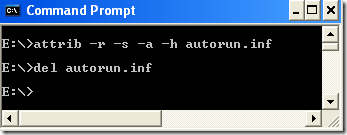 If the autorun looks the same like the sample version above, there is nothing to worry. If not… try to use “attrib” command to remove the hidden, read only and systems attribute as shown below.